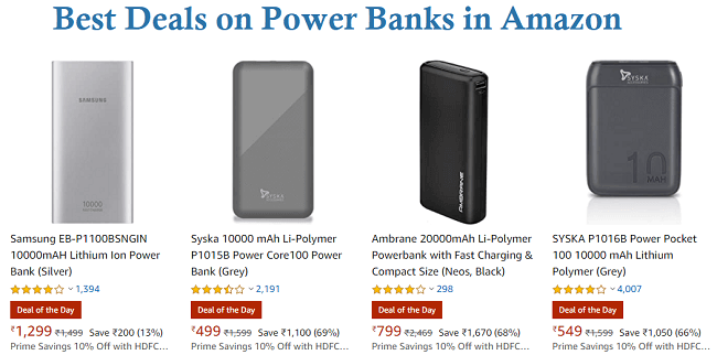 Amazon is offering massive discounts on Power banks on the on going Amazon Great Indian festival and along with offer you also get extra 10% discount on HDFC Credit and Debit Cards.