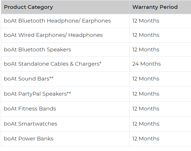 Below you can see the different boAt product’s warranty details.