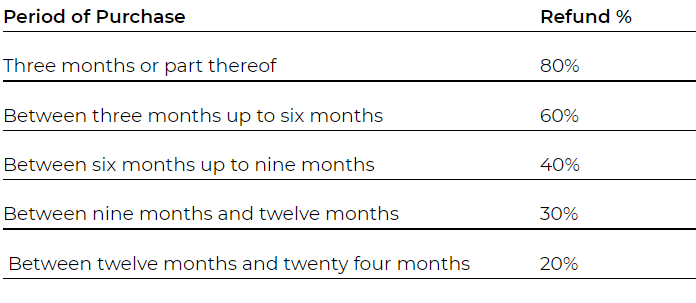If the boAt is not able to repair/replace your product during the warranty period, boAt will give you the option to offer a product with the same features or give a refund, based on the utilization period of the product below.