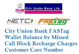 If you using City Union Bank CUB FASTag for your Four Wheeler Vehicle then by using missed call service you can check City Union Bank FASTag balance, from your registered mobile number just give a missed call to below CUB FASTag balance number. See below for CUB Bank FASTag Wallet Balance, How to Block, Recharge, FASTag Charges, Customer care number and other details.