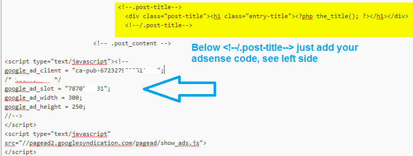 4. After the end of “<!–/.post-title–>”, just copy and paste the Adsense code and save the file. See above image.