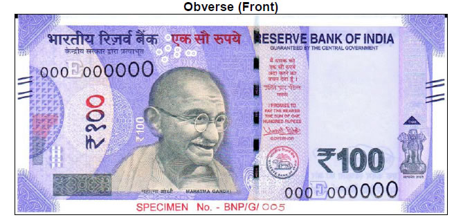 For visually impaired intaglio or raised printing of Mahatma Gandhi portrait, Ashoka Pillar emblem, raised triangular identification mark with micro-text 100, four angular bleed lines both on the right and left sides